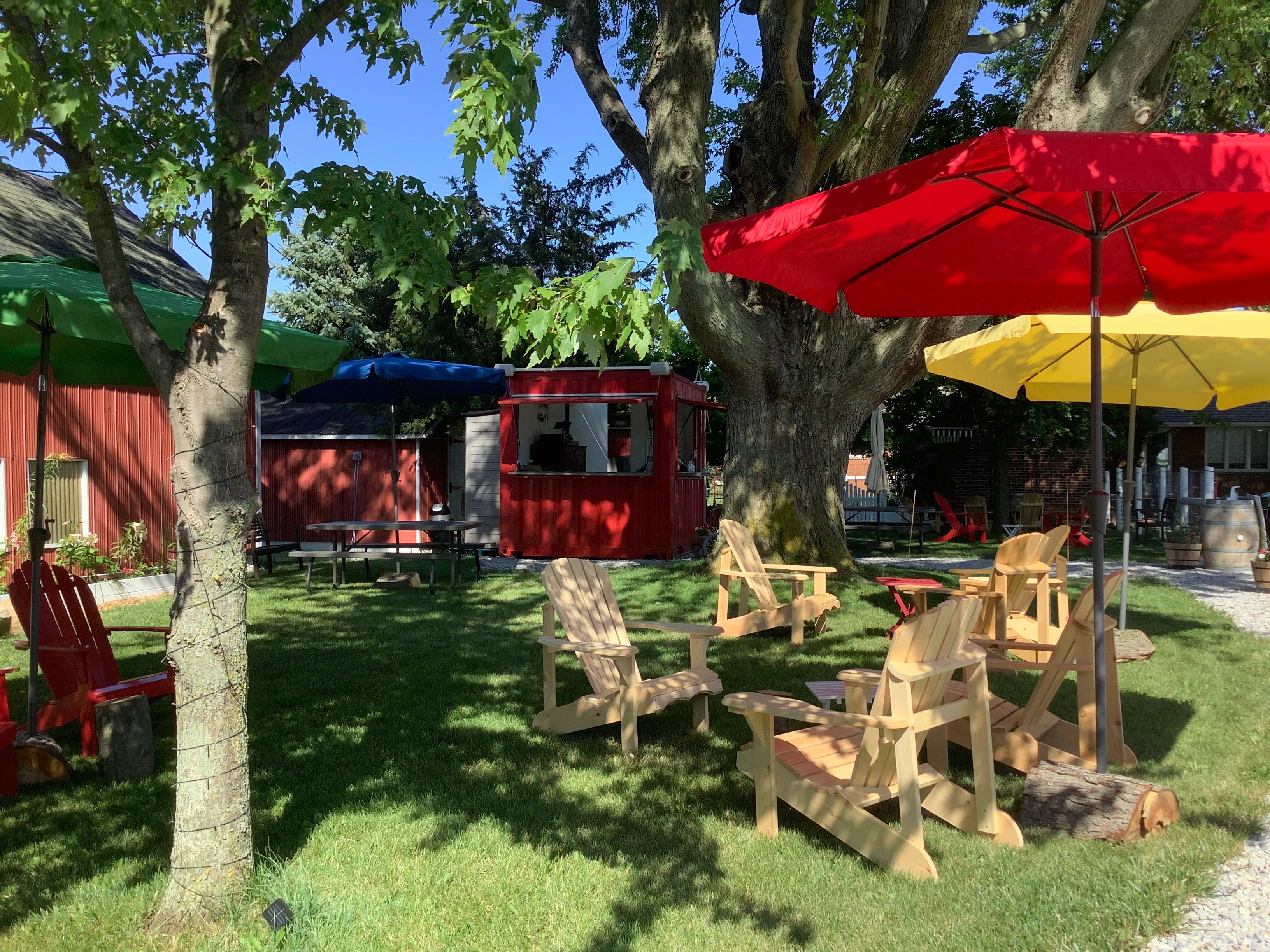 A visit to our ‘outdoor tasting garden’ is a unique experience. Located under the largest of the farm’s maple trees, the centrepiece of the garden is our tasting bar / reconditioned shipping container.