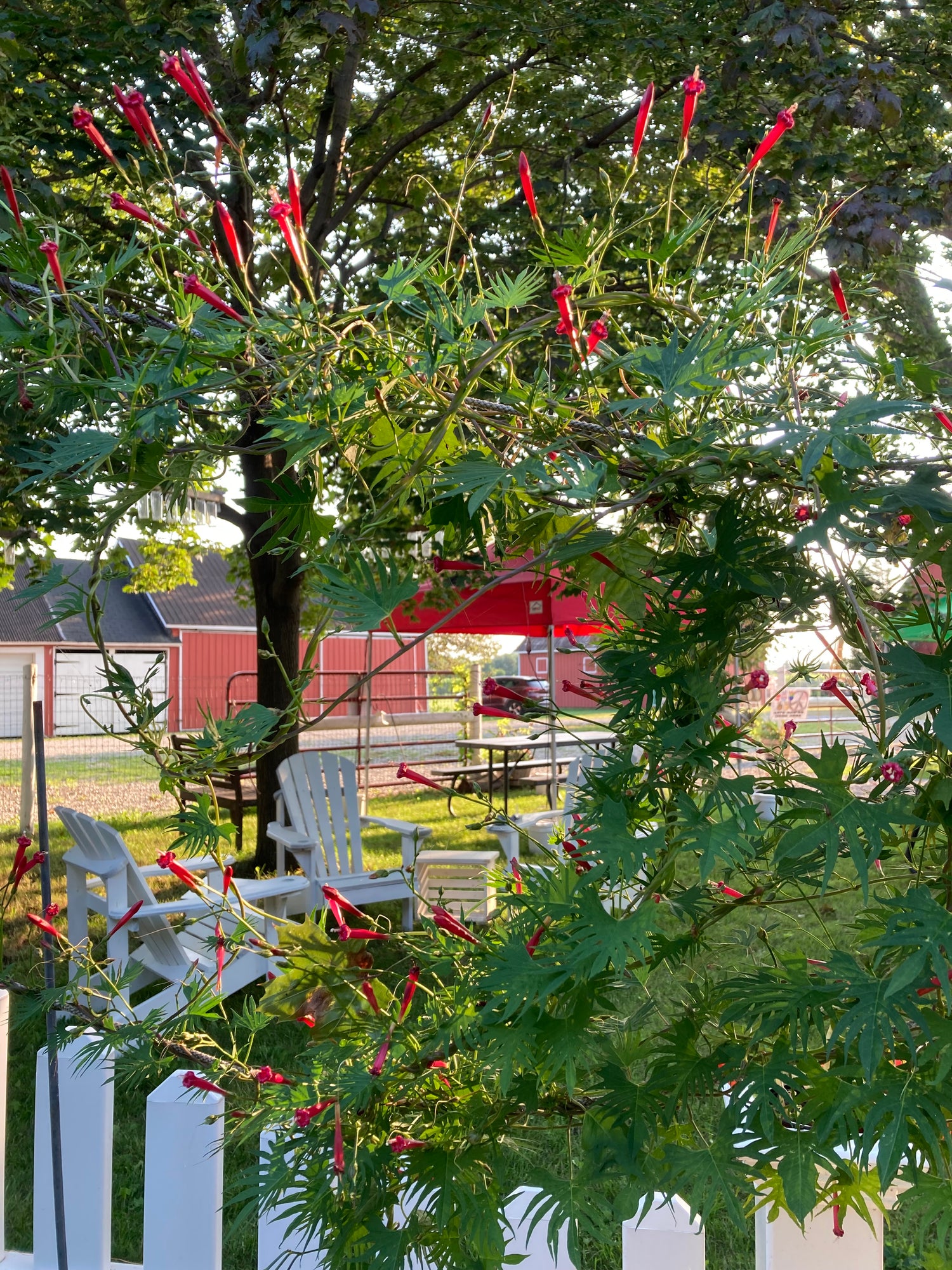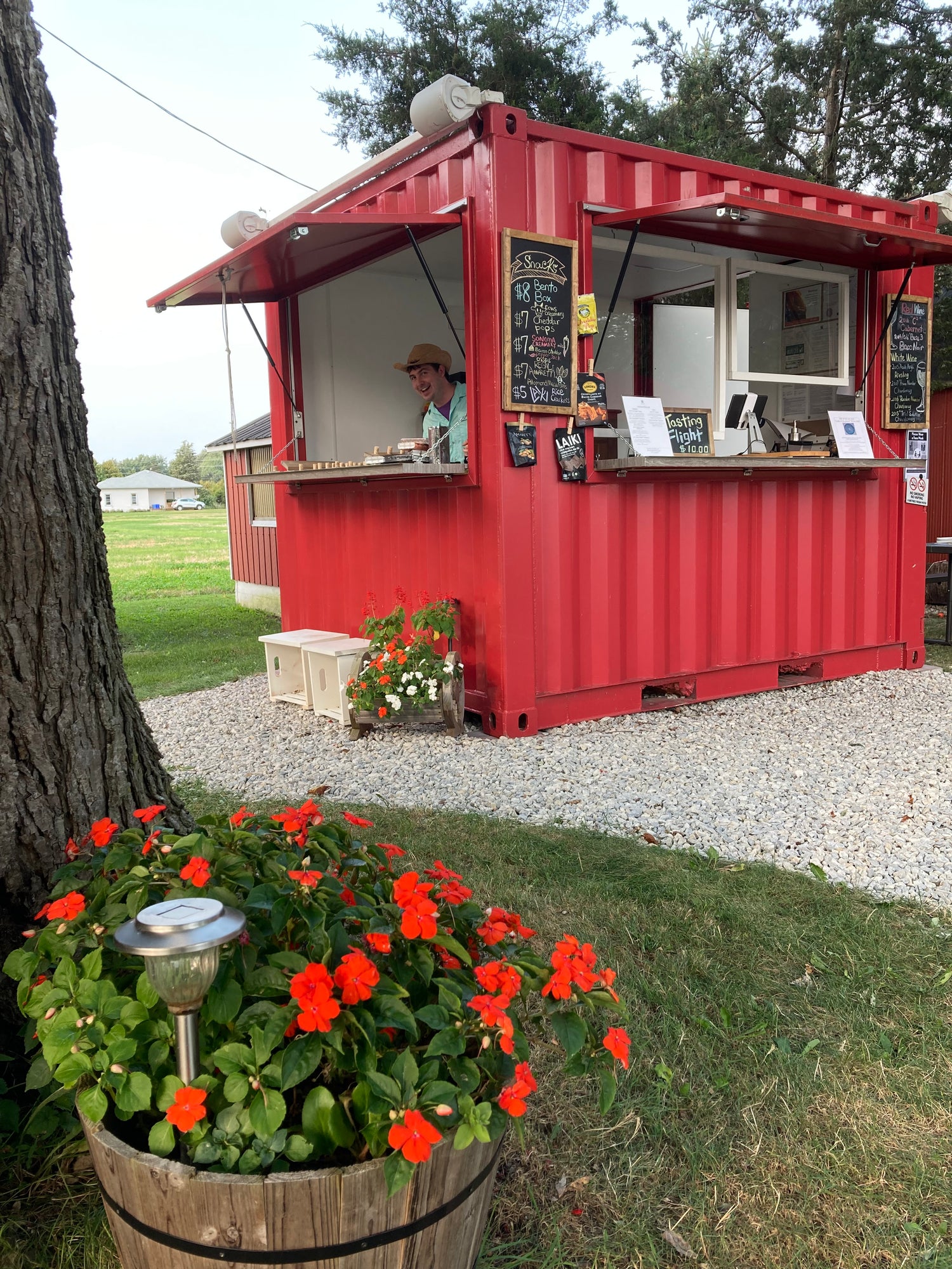The effect is a bit West Coast, a bit food-truck festival, with some heritage farm buildings thrown in for colour. Surrounding the tasting bar is a garden with its own microclimate. (It’s a very big tree.) And we have plenty of picnic tables and Muskoka chairs to let you enjoy the garden.